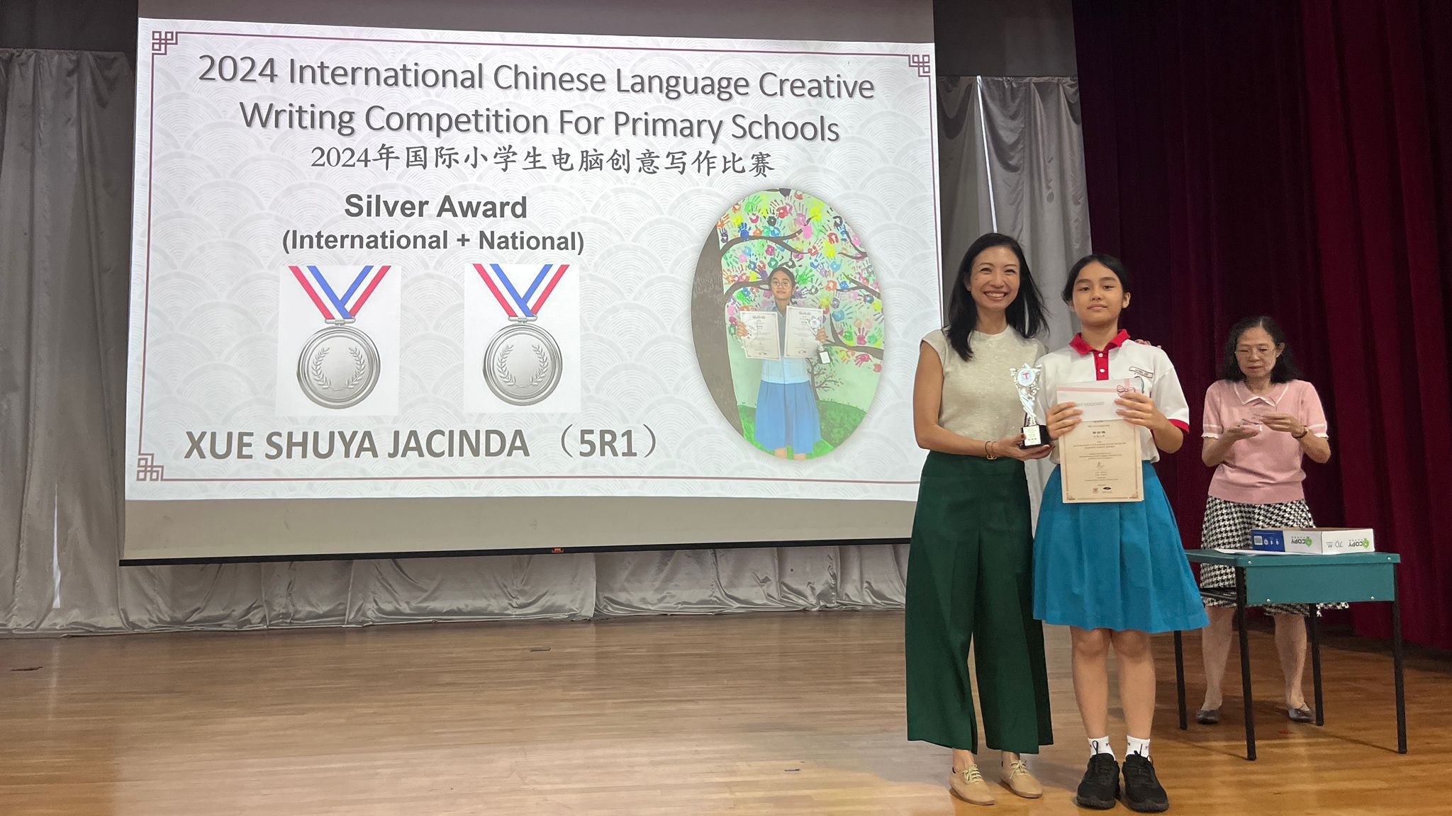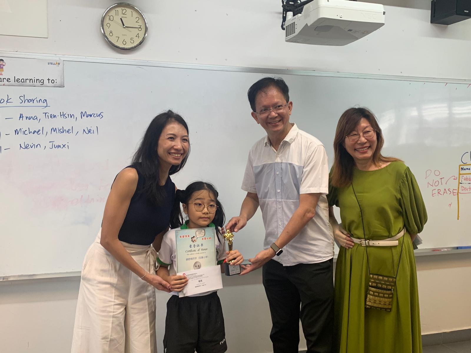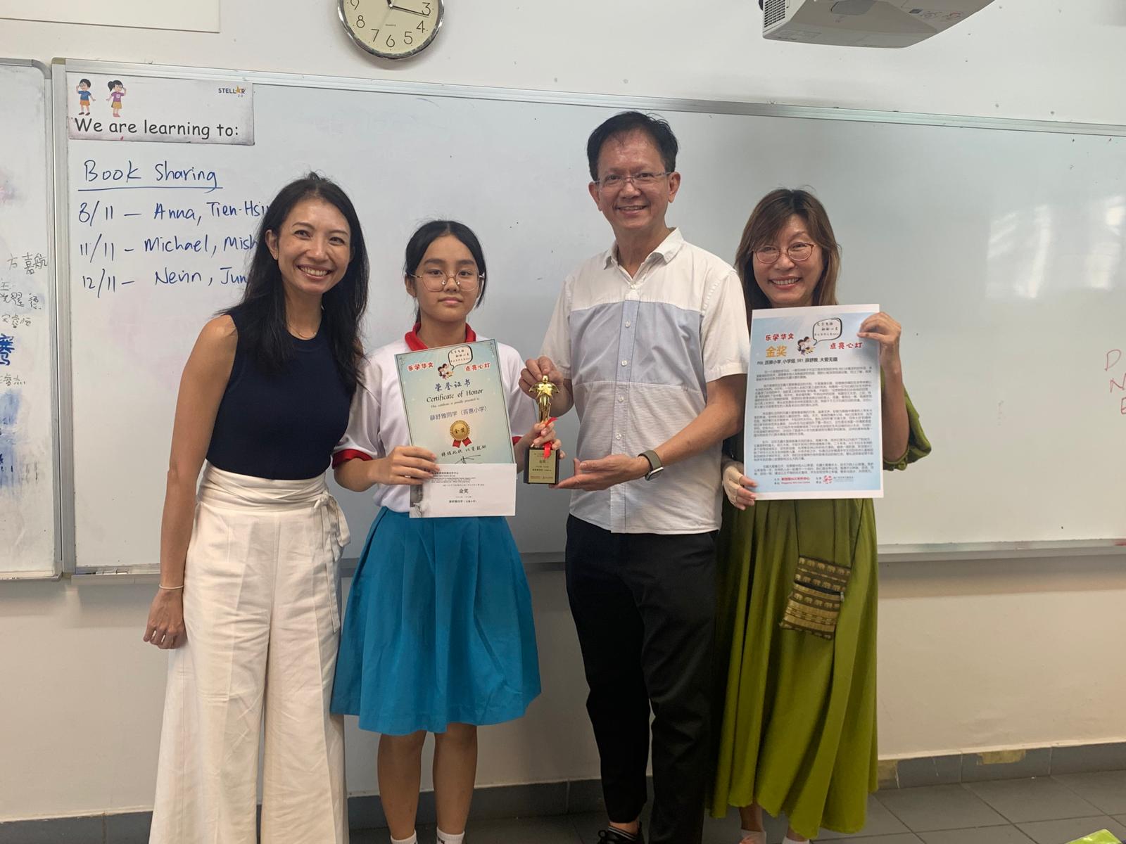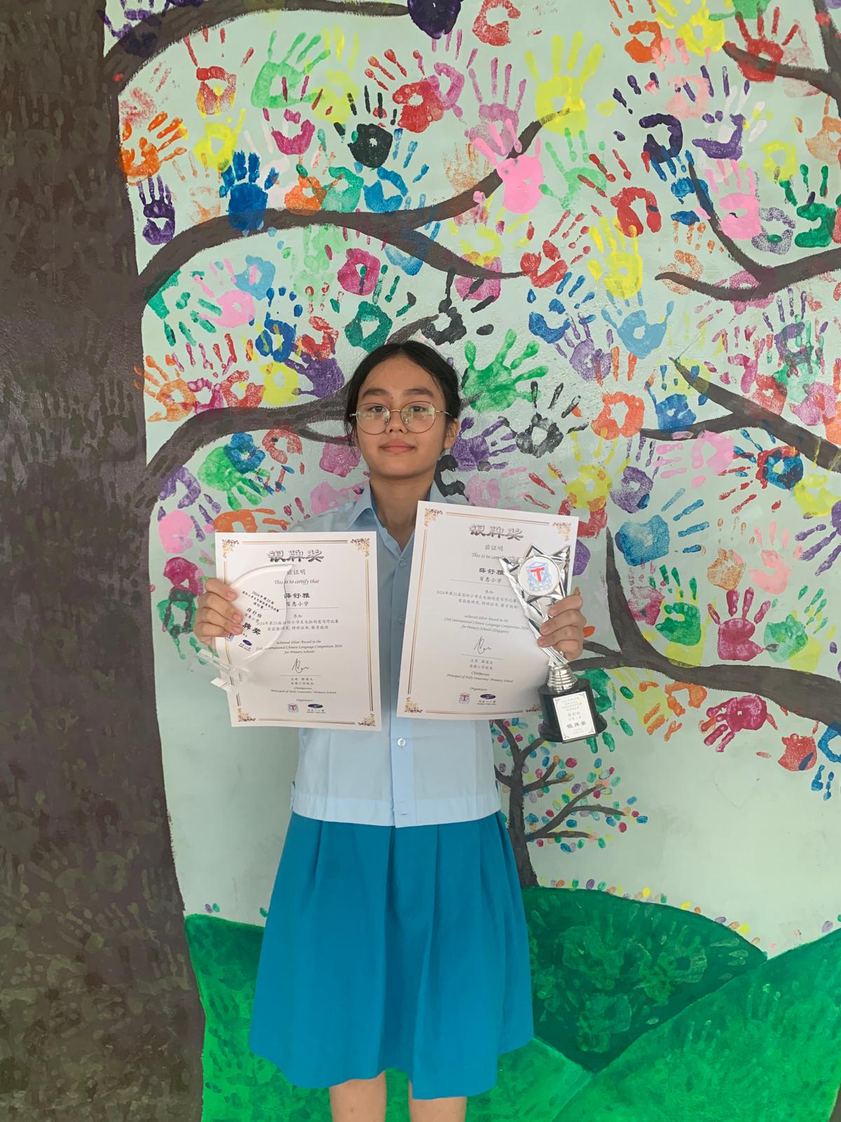 2024年,在由新加坡阿弥陀佛关怀中心主办的《文字飞扬 触动心灵》华文写作大赛中,我校薛舒雅同学获得金奖,袁恩睿同学和薛舒晴同学获得银奖。